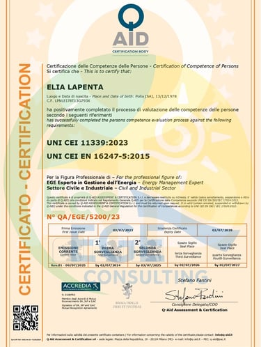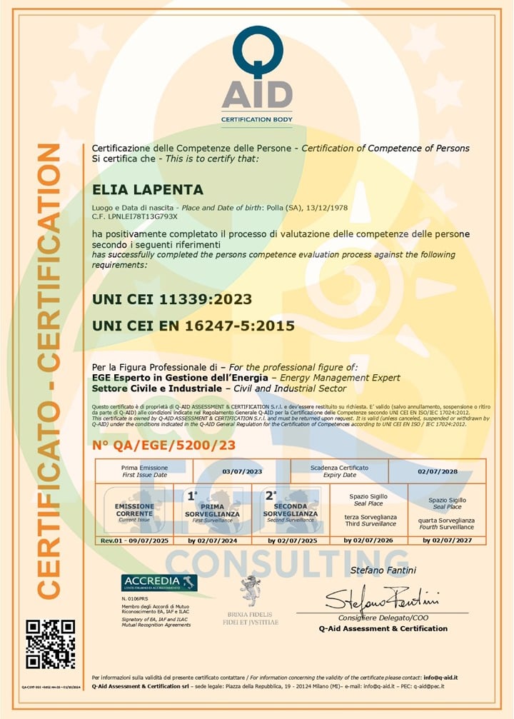 Mi chiamo Elia Lapenta, sono un E.G.E. – Esperto in Gestione dell’Energia certificato secondo la norma UNI CEI 11339:2019 con esperienza nella consulenza energetica per privati, aziende